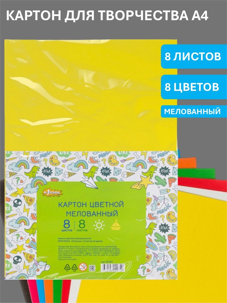 Количество листов - 8, количество цветов - 1. Предназначен для рисования, аппликаций и других видов творчества. В наборе листы размером 201x282 мм. Упаковка - полиэтилен. В зависимости от партии плотность картона может отличаться от 200-240 г/кв.м. В рамках ребрендинга производится перевод данного артикула с ТМ № 1School на ТМ Выбор есть с сохранением всех потребительских характеристик товара. На переходный период допускается поставка данной продукции в двух вариантах дизайна.