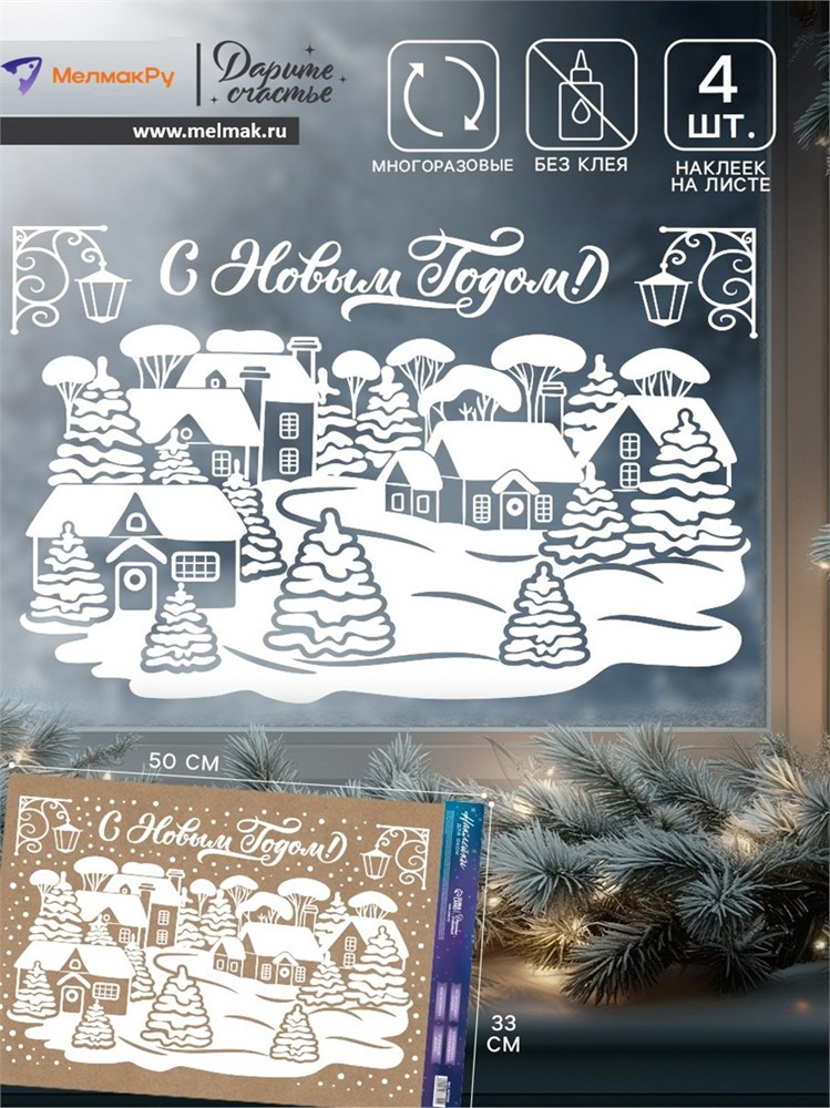 Наклейки на окна Новый год заснеженный город 33*50см Дарите Счастье